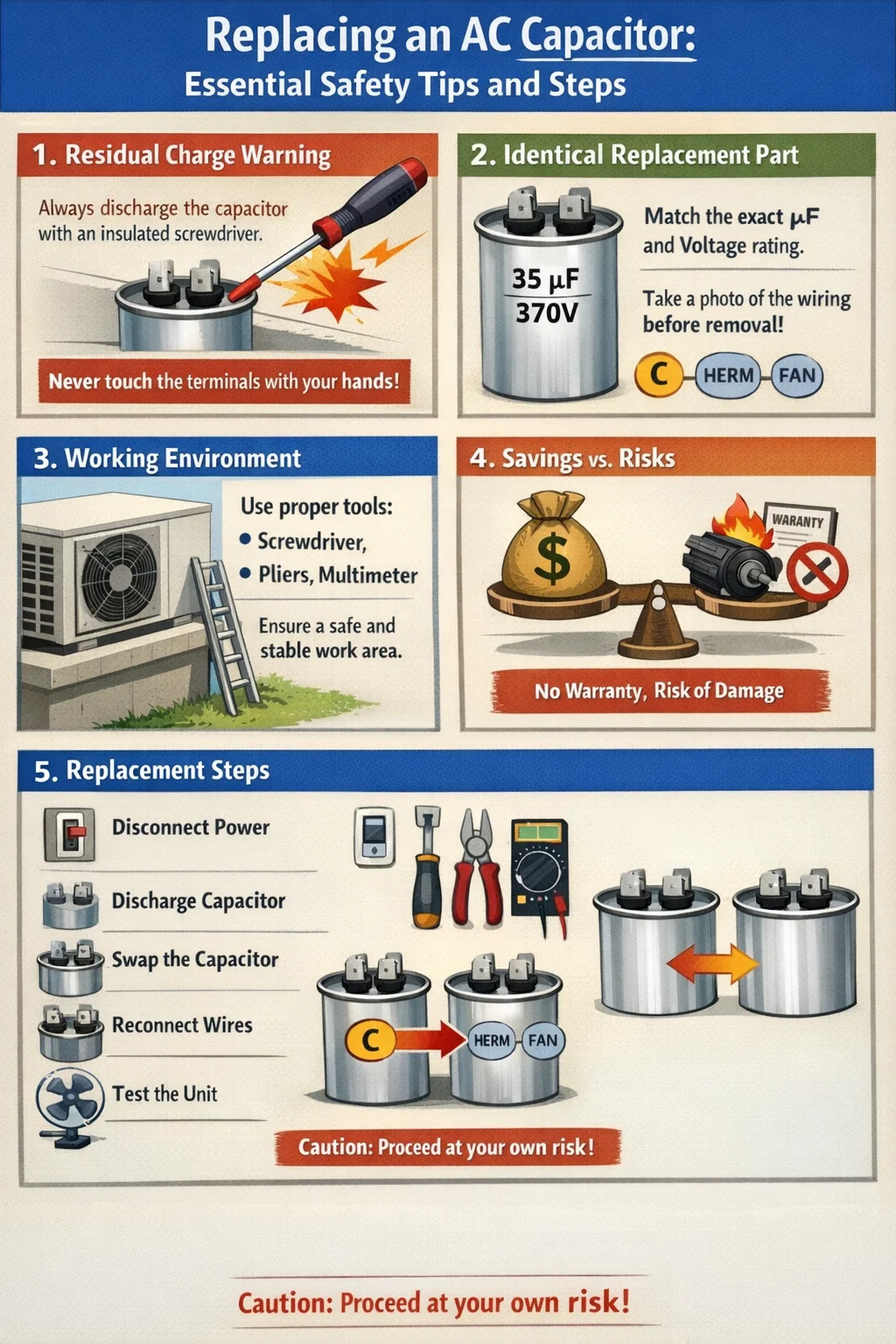 보증 무효화: 에어컨의 보증 기간이 아직 남아 있는 경우 AC 커패시터를 직접 교체하면 제조업체의 보증이 무효화될 수 있습니다.