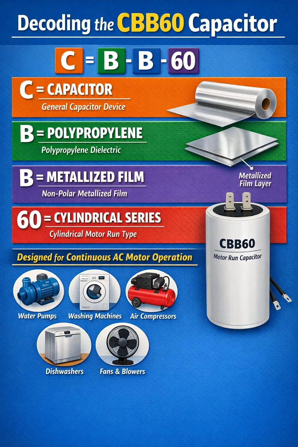 전기 부품에서 용어는 CBB60 커패시터의 특정 유전체 재료와 기능 범주를 식별하는 중국 산업 표준 코드(GB)입니다. 일반 영어로 CBB60은 금속화 폴리프로필렌 필름 모터 구동 커패시터 원통형 하우징 모양. 이 구성 요소는 모터가 작동하는 동안 지속적으로 에이C 회로를 유지하도록 특별히 설계되어 모터 토크와 효율성을 유지하는 데 필요한 위상 변이를 제공합니다.